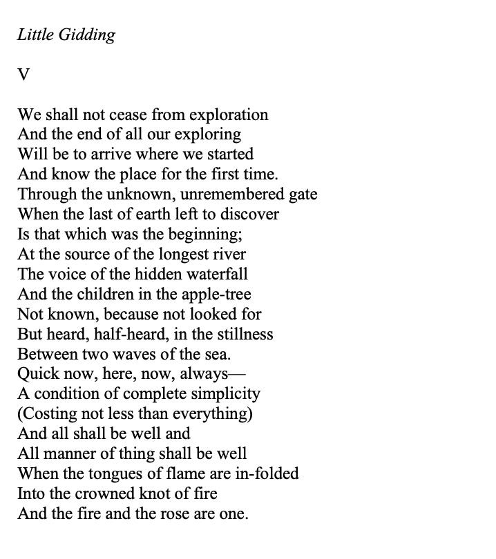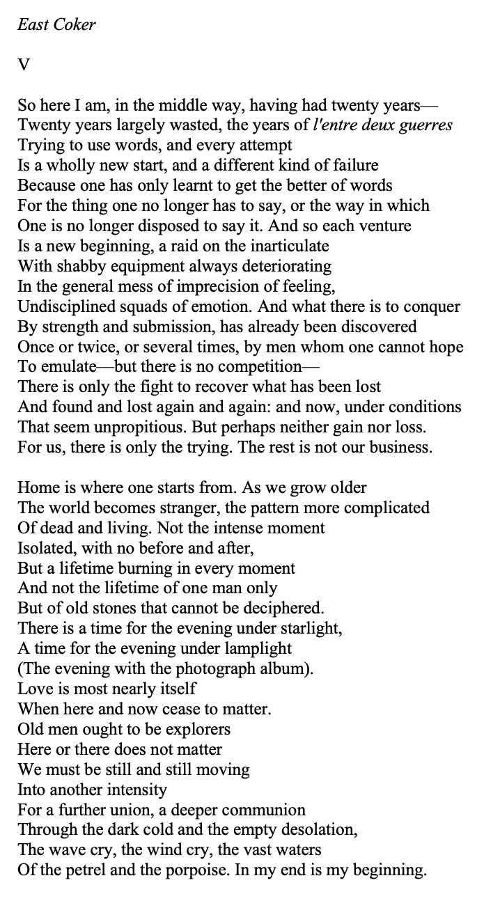 In case it’s of interest, I’ve copied the full T. S. Eliot poems below. Both are from his Four Quartets (1943). “Old men ought to be explorers” is from East Coker V, and the other lines are an excerpt from Little Gidding V. If you want to hear these poems read aloud by T. S. Eliot himself, which I highly recommend, click here (starts at 3:12).