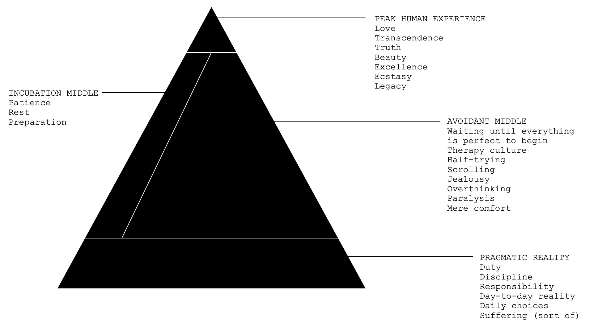 We also trick ourselves into thinking that the avoidant middle is something else, the “incubation middle” (see pyramid). The avoidant middle is good at pretending to be something virtuous or necessary. “I’m tired.” “I’m waiting for something good to happen.” “I’m preparing myself for what comes next.” But most of the time, we’re not in the incubation middle, and we know it. The incubation middle has a different energy entirely. It’s hopeful, patient, trusting. This is where we’ve applied to the grad school program and we’re waiting to hear back. It’s where we’re two weeks into a new routine and haven’t seen results yet, but we know, if we stick with it, we eventually will.
